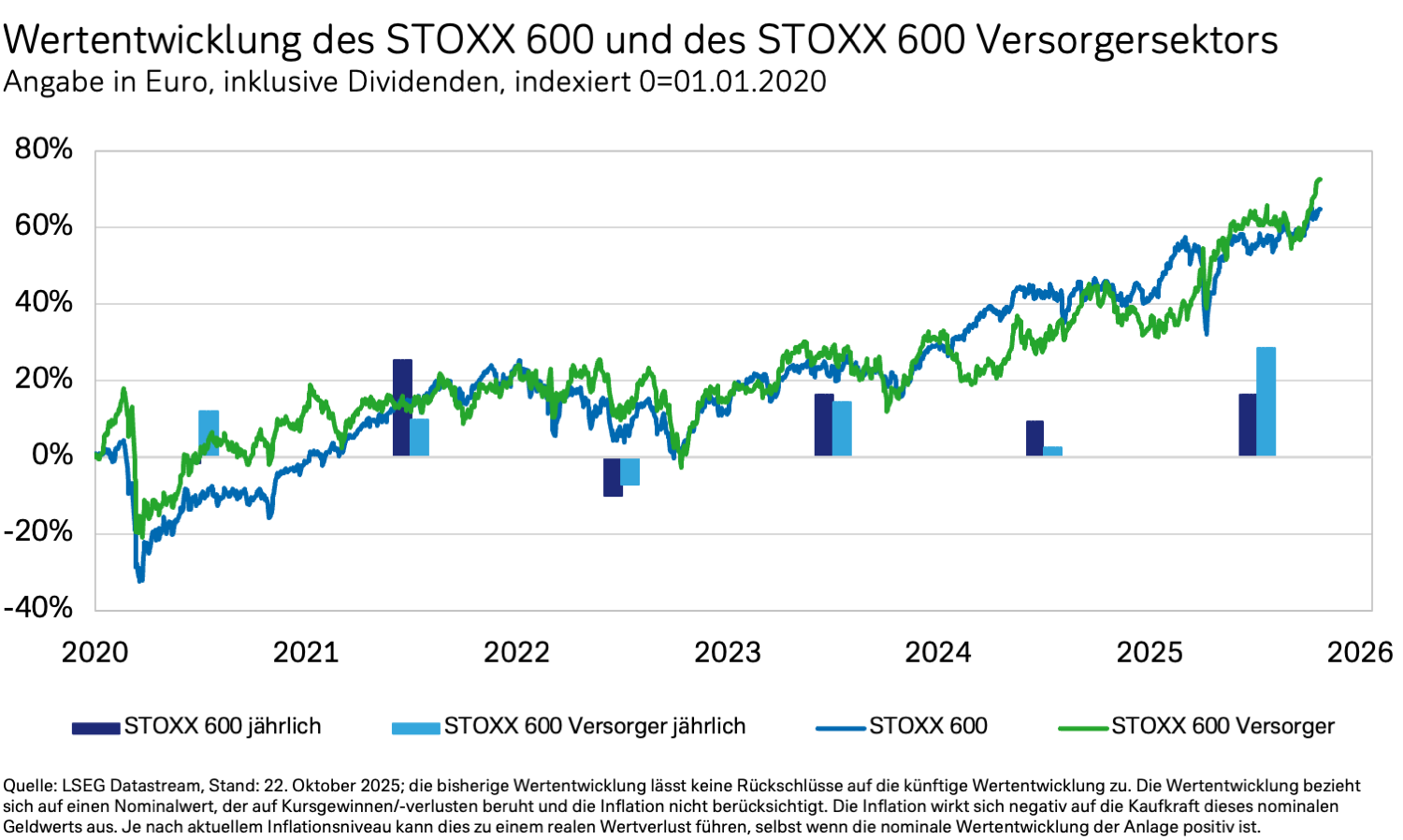 Aktien europäischer Versorger konnten in den vergangenen Wochen merklich zulegen. Von den letzten 23 Handelstagen schloss der Versorgersektor des STOXX 600 22 Tage im Plus: ein Rekord. Zuletzt gab es eine ähnliche Serie mit 20 von 22 positiven Handelstagen im Jahr 1998. Seit Anfang des Jahres erzielte der Sektor eine Gesamtrendite von 29 Prozent und damit mehr als der Gesamtindex, der bei 16 Prozent liegt. Sinkende Kapitalmarktzinsen und ein unsicheres handels- und geopolitisches Umfeld haben Versorgeraktien für Investoren, die stabile Erträge suchen, attraktiver gemacht. Die erwartete Dividendenrendite steht immerhin bei knapp fünf Prozent. Zudem haben Analysten ihre Gewinnerwartungen für den Sektor im Laufe des Jahres sukzessive angehoben, was eine Bewertung auf Basis des Kurs-Gewinn-Verhältnisses von 14 nach wie vor fair erscheinen lässt. Auch wenn ich nach der bisherigen Gewinnsträhne eine kurzfristige Gegenbewegung für wahrscheinlich halte, erscheint mir eine Beimischung von schwankungsarmen europäischen Versorgertiteln nach wie vor sinnvoll.